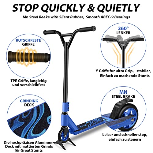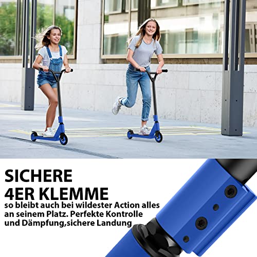 LANGLEBIGES UND SICHER: Das robuste 4er klemme-kompressionssystem mit gewindefreier stahlgabel macht den stunt-scooter robust und stabil. Die hinterrad-reibungsbremsen, mattierten grinds aluminum anti-rutsch-deck und die geriffelten griffe für die sicherheit der benutzer