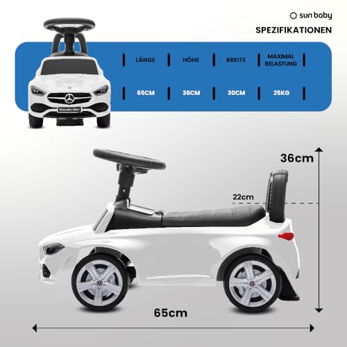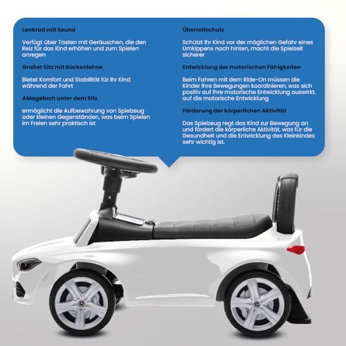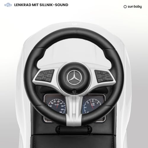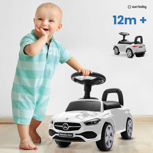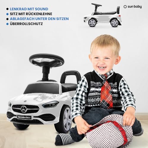sun baby Rutschauto ab 1 Jahr Mercedes C-Class, Kinderfahrzeug für Jungen und Mädchen mit Audio-Lenkrad, Ablagefach, Kippschutz (Weiß)