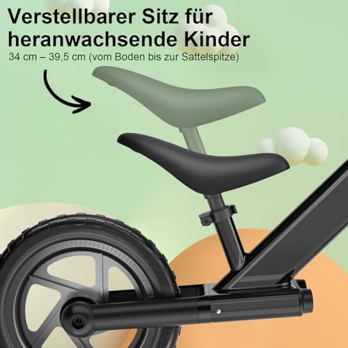 Verstellbarer Sitz für wachsende Kinder: Der Sitz lässt sich von 34 cm bis 39.5 cm in der Höhe verstellen, um sich an die Größe Ihres Kindes anzupassen. Das hochwertige PU-Material sorgt für ein angenehmes und stabiles Fahrgefühl – perfekt für kleine Entdecker.