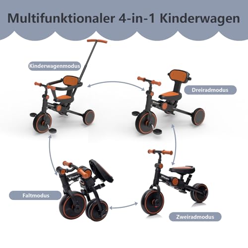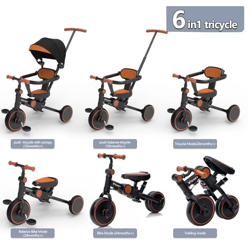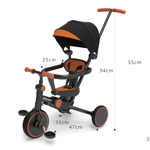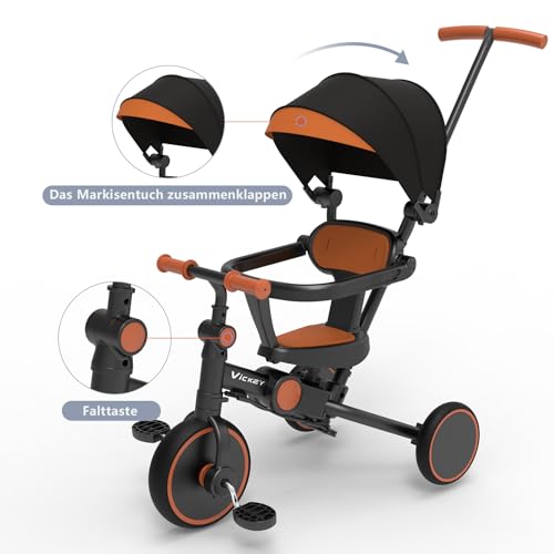 vickey 6 in 1 Kinderdreirad für 1-6 Jahre Laufrad Dreirad Lauflernhilfe Lauffahrrad mit Schubstange, Lenksystem Stange, Radkupplung, abnehmbare Pedale & höhenverstellbarer Sitz + Sonnendach, Schwarz
