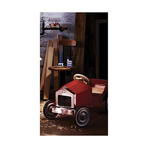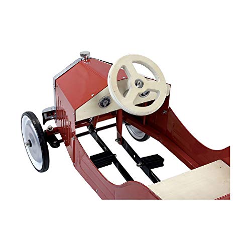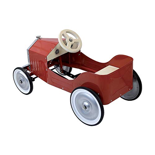 Großes Auto mit Pedalen aus Metall, rot lackiert, Naturholzelemente.