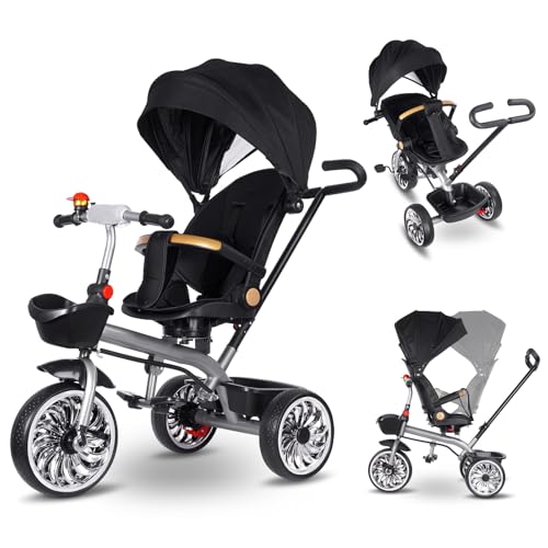Vinteky Kinderdreirad 6in1, Dreirad mit Schubstange Lenksystem, drehbarer Komfortsitz, Kinder Dreirad mit Elterngriff, Sonnendach, Gummiräder, Jogger vorwärts und Rückwärtsfahrt, Buggy Fahrrad