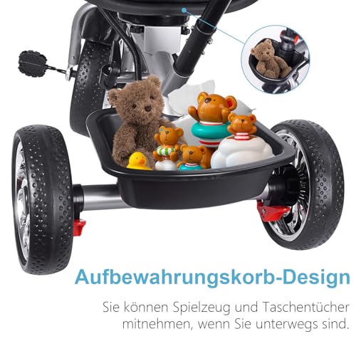 【Qualitativ hochwertige Ausstattung】 Das Dreirad verfügt über Fußstützen und abnehmbare Pedale, Staufächer im Inneren des Dreirads. Die EVA-Schaumstoffräder sind geräuscharm, pannensicher und stoßfest für ein komfortables und lang anhaltendes Fahrerlebnis.